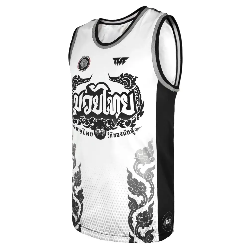 The white tank top features a black Thai traditional pattern which is influenced by the graceful Hongsa and the guardian of the treasure, Naga.